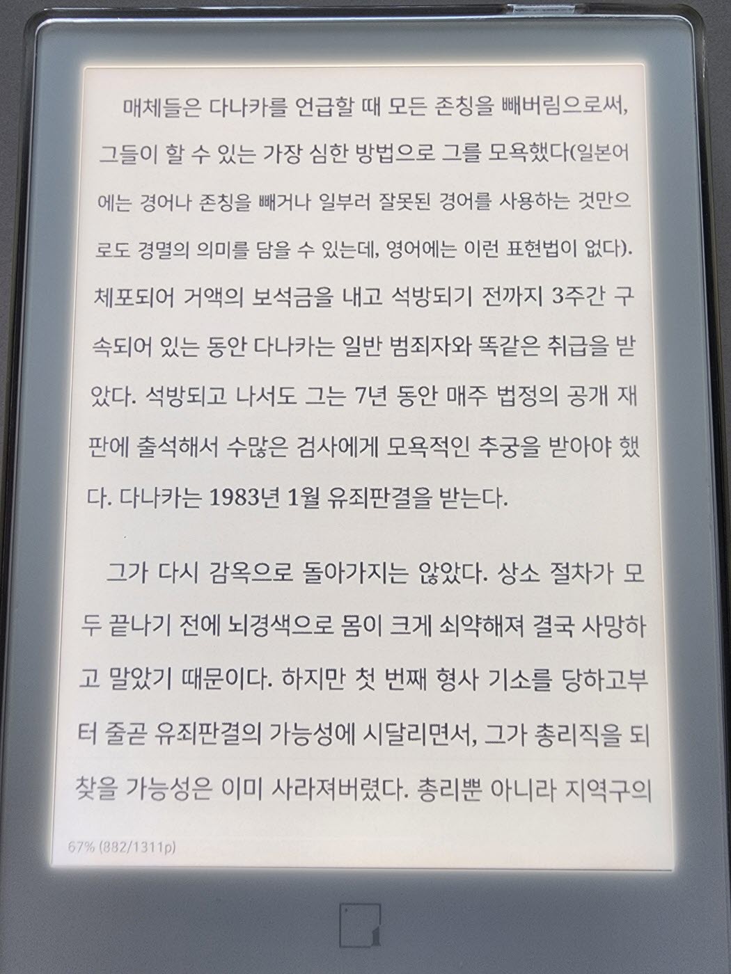 그리고 백라이트 방식이 아닌 프론트라이트 방식이라 피로감도 덜하고 장시간 독서가 가능했습니다.